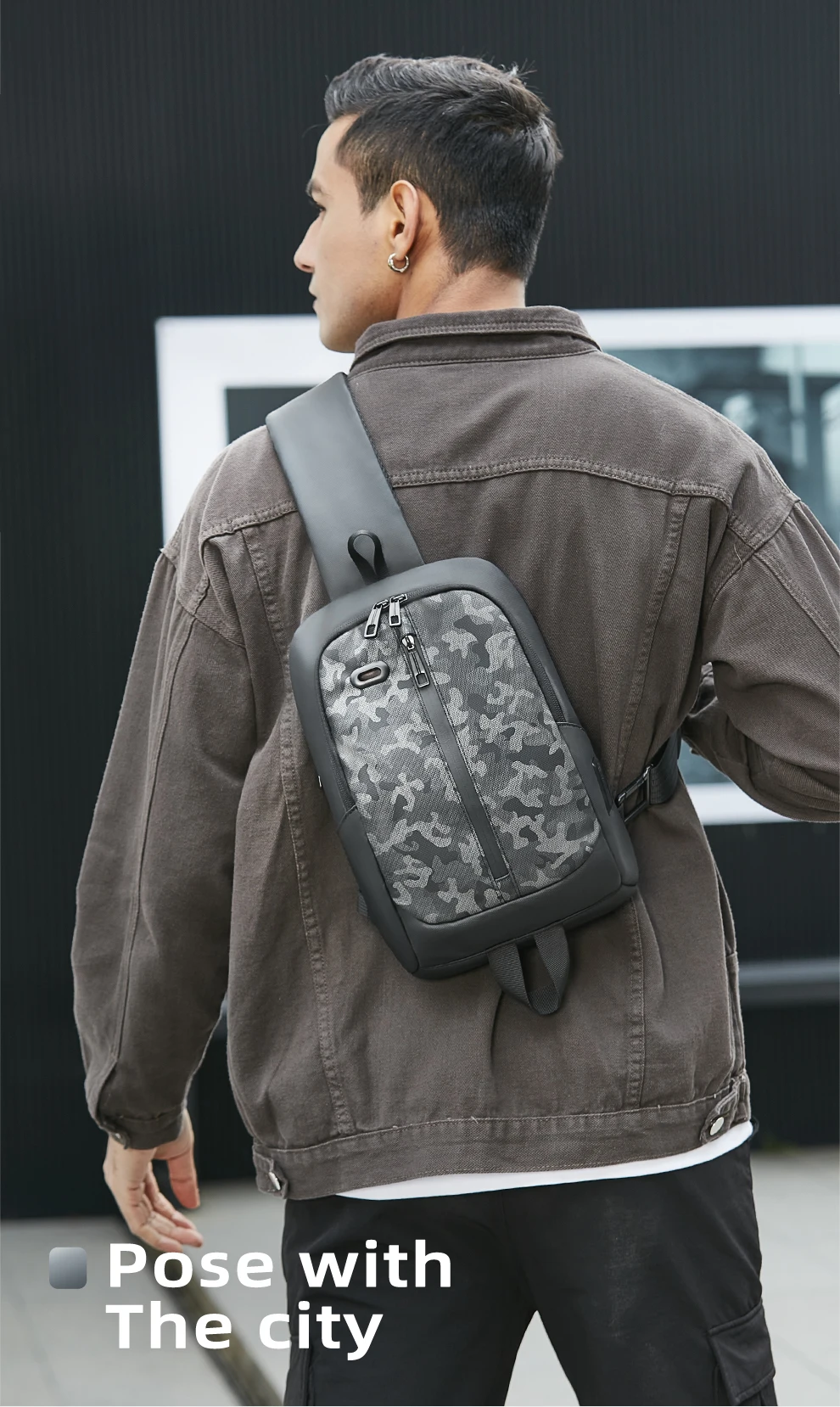 Uma sling bag urbana com visual camuflado discreto e estrutura inteligente para o dia a dia.